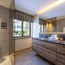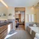 The top floor also houses the master en-suite bedroom, a luxurious retreat featuring a stand-alone tub in the center of the room, a spacious shower, and his-and-hers sinks. A separate WC is accessible from both the bedroom and the hallway.