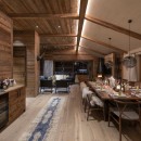 Spanning three floors, all accessible by stairs and a lift, the apartment’s top level hosts the main living area. This open-plan space includes a lounge, dining area, and kitchen. Clean lines and sharp edges create a contemporary, somewhat masculine aesthetic, softened by rich textiles and vibrant accents. A plush green velvet sofa anchors the living room, providing the perfect spot to unwind while enjoying breathtaking alpine views through floor-to-ceiling windows. The village of Lech is beautifully illuminated at night, with a surreal mountain backdrop. Natural light floods the room during the day, and guests can step out onto the terrace to bask in the spring sunshine. A wood-burning stove in the corner of the living area completes the scene for ideal post-ski relaxation.