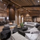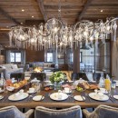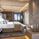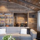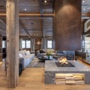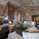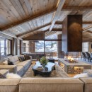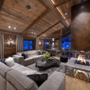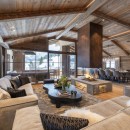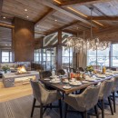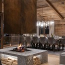 Accessible by lift or stairs, the chalet's top floor welcomes guests into a graceful living space designed for indulgent, cozy evenings together. Wood-paneled walls and rich fabrics add warmth to the soothing grey palette. A striking wood-burning fireplace, set on a marble block and enclosed by glass, serves as the centerpiece of the open-plan living and dining room. This elegant feature can be enjoyed from both the sophisticated living area and the spacious dining room.
