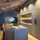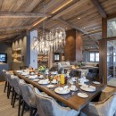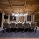 As night falls, the sumptuous interiors of Chalech M create a perfect setting for staying in. The large dining table seats up to 12 guests, illuminated by a dramatic chandelier reminiscent of stalactites. A sleek, fully-equipped kitchen stretches back from the dining area, featuring ample storage and a dedicated wine cabinet. A central island with stool seating for four adds to the kitchen's appeal.