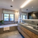 Ascending to the first floor, you’ll find the master bedroom suite, an impressive space that epitomizes luxury. The suite includes a walk-in wardrobe, a seating area with a plush velvet sofa, a desk, balcony access, and a tranquil bedroom area, all tastefully decorated in cool tones with thoughtful lighting. The en-suite bathroom, featuring a freestanding bath and separate rain shower, adds to the suite's luxurious ambiance. Additionally, this floor offers another twin/double bedroom with an en-suite bathroom and a cozy bunk room that sleeps two, complete with an en-suite shower room.