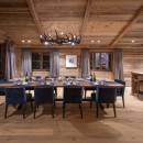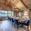 The top floor of the chalet is dedicated to the grand open-plan living and dining area, along with a stylish kitchen. A striking central fireplace creates a warm and inviting atmosphere, while the double-height ceilings and expansive windows enhance the sense of space. Large glass sliding doors open onto the balcony, where you can take in breathtaking views of the village and snow-covered mountains. The space is elegantly furnished with modern pieces accented in navy blue. The dining table, which seats 12, is ideal for hosting sophisticated dinners with family and friends. Overlooking the dining area, the kitchen is a chef's dream, featuring a striking patterned tile floor, matte black cabinetry, and modern fixtures. There is also a cozy TV room that can be closed off from the main living area, offering a perfect retreat for children while adults enjoy their evening.