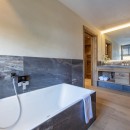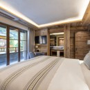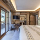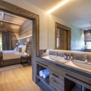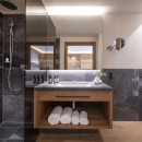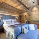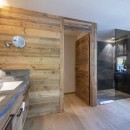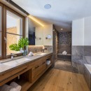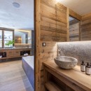 This floor also features a stylish twin/double bedroom with en-suite bathroom and separate shower, combining aged alpine wood with sleek slate finishes—echoed in all bathrooms throughout the property.