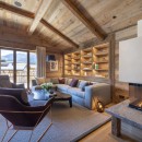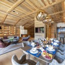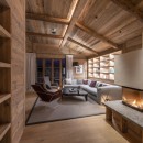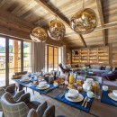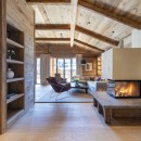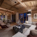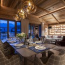You enter on the top floor, where an open-plan living, dining, and kitchen area awaits. With double-height ceilings and large windows, the space feels bright and expansive, opening onto a terrace with views of the village and surrounding peaks. A modern open fireplace adds warmth and character, while soft lighting and elegant fabrics in muted tones create a welcoming, sophisticated atmosphere. The dining area comfortably seats eight beneath striking pendant lights, and the adjoining kitchen is sleek, spacious, and fully equipped.