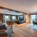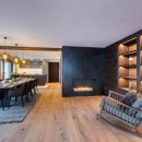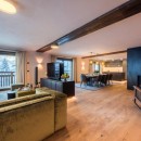 At the heart of the apartment, the open-plan living and dining area takes center stage. The dining space comfortably accommodates a large group, while the other half of the area features inviting, expansive sofas—an inviting space to relax and unwind by the contemporary fireplace. Each window in the living area frames captivating views of Lech, providing a stunning backdrop for witnessing sunsets over the mountains and spending winter evenings with loved ones.