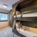 Venturing through the spacious hallway leads to another bedroom, which also presents the option of a twin or double arrangement. It opens to a sizable south-facing terrace, perfect for enjoying morning coffee while basking in the sunlight and mountain vistas. This bedroom shares a private shower room with the charming children's bunk room.