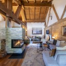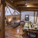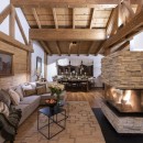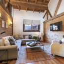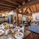Upstairs, the open-plan living space boasts a loft-style design with high ceilings, large windows, and stunning mountain views. A central wood-burning fireplace connects the spacious dining area and stylish kitchen with Miele appliances. The living room offers two inviting areas—one a TV snug, the other a relaxed lounge perfect for post-ski drinks or quiet reading.