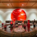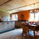The main dining table accommodates up to 12 people comfortably. From the living area, massive oak sliding doors lead into the spacious kitchen, which seamlessly blends Tyrolean woodwork, contemporary art, and modern steel appliances. In addition to the main dining area for 12, there is an additional breakfast table in the kitchen, perfect for children's meals.