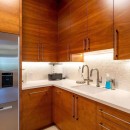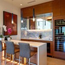 Entertain with flair in the gourmet kitchen, equipped with a built-in espresso maker, sparkling water dispenser, and top-of-the-line appliances. Accordion glass doors open to a covered heated entertainment deck with an outdoor kitchen, alfresco dining, and a fire pit, while the adjacent kitchen bar features a wine fridge and wet bar.
