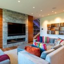 On the lower garden level, a second expansive entertainment space awaits, featuring sectional seating, a large home theater system with surround sound, a fireplace, and a well-appointed wet bar equipped with a wine fridge, ice maker, sink, dishwasher, and microwave.