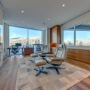 Adjacent to the main floor living room is a generous executive study, complete with both a regular and electronic standing desk. This private sanctuary offers another entertainment center, comfortable leather chairs, a fireplace, and a heated covered patio shared with a bedroom on the same level.