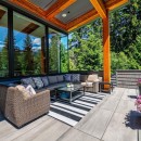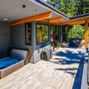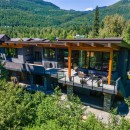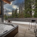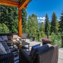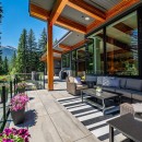 Floor-to-ceiling windows encircle the main floor, flooding the space with abundant natural light and providing glimpses of the breathtaking Whistler and Blackcomb Mountains. Accessible from the living area, a spacious balcony overlooks the protected woodland surrounding the property, serving as an idyllic setting for outdoor entertainment. Complete with a BBQ, patio furniture, an outdoor fireplace, and a sunken hot tub, this outdoor haven is truly inviting. The extensive patio stretches along the entire length of the upstairs living area, seamlessly merging indoor and outdoor spaces, further enhanced by the adjacent parklike lot, which is particularly popular during the summer months.