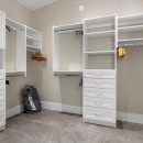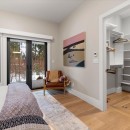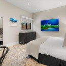 The lower level accommodates the remaining three bedrooms and a den. Two of the bedrooms feature queen beds, ensuite bathrooms, and captivating views with direct access to the tree preserve. The larger king bedroom has its separate bathroom, shared with the den/bedroom 5, both of which provide generous workspace. The den/bedroom 5 is well-appointed with a smart TV and a high-speed printer.