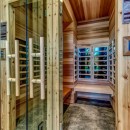 The main floor boasts an open concept design encompassing the living room, kitchen, and dining spaces. There's plenty of seating available, including a new custom dining table for formal dining and additional seating at the kitchen bar. You can cozy up by the large woodburning fireplace or enjoy a summer BBQ on the front patio, which offers breathtaking views of Whistler Mountain and the Tantalus mountain range. On this floor, you'll also find another master bedroom with a king bed and ensuite bathroom. Adjacent to the spacious and fully stocked kitchen, there's a new spa area complete with an infrared sauna, space for yoga or massage, and access to the hot tub.