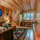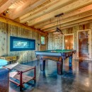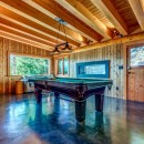 In the games room, equipped with a billiard table, two additional smaller bedrooms share a bathroom. One bedroom has a queen bed, while the other has a double bed. This level also provides access to the back patio, which is nestled into the rock face. This serene outdoor space features an indoor/outdoor gas fireplace, a hammock, and a small firepit with seating.