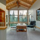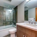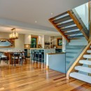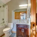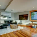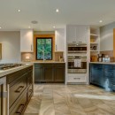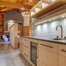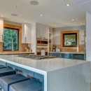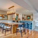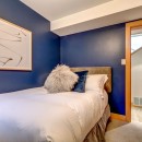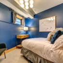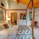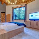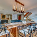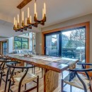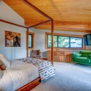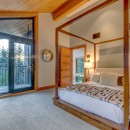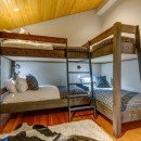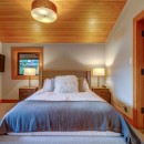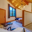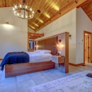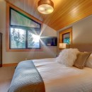 The well-appointed kitchen is fully equipped and includes seating for four guests at the bar, as well as a beautifully crafted live-edge dining table and additional bench seating to accommodate eight more guests. On this level, you'll also find the fourth bedroom, complete with a queen bed, television, and a separate full bathroom.