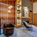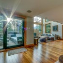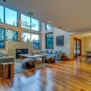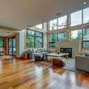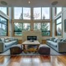 Ascending to the upper floor, you'll discover the primary living areas. The bright and open-concept living room features vaulted ceilings, floor-to-ceiling windows that bathe the space in natural light, and a striking gas fireplace as the centerpiece. Two expansive front patios contribute to the open atmosphere, with outdoor lounge seating, entertainment spaces, a hot tub, an outdoor fireplace, and a smoker BBQ, creating an inviting ambiance, particularly during the summer months. Another den/reading room with a large articulating smart television can be found adjacent to the main living area.