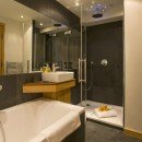 Bedroom 1: First floor bedroom with double bed, balcony and en-suite bathroom with bathtub, shower, vanity and wc. 2 guests maximum