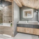 Indulge in the epitome of relaxation at the private Penthouse B spa, where a generously sized jacuzzi beckons. Unwind within the sauna and hammam, bask in the radiant glow of the crackling fireplace beside the jacuzzi, and rejuvenate after a day of mountain exploration. The exclusive spa also boasts private changing rooms, restrooms, and showers.