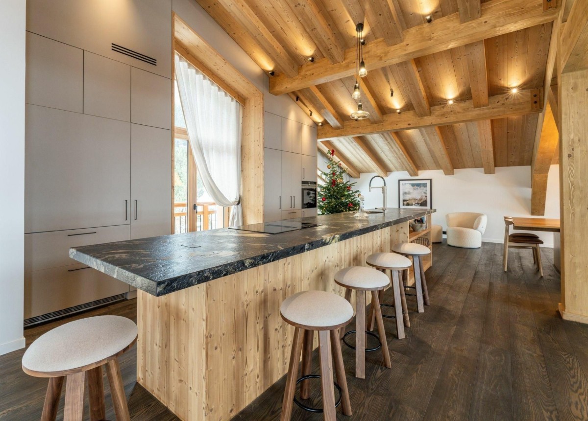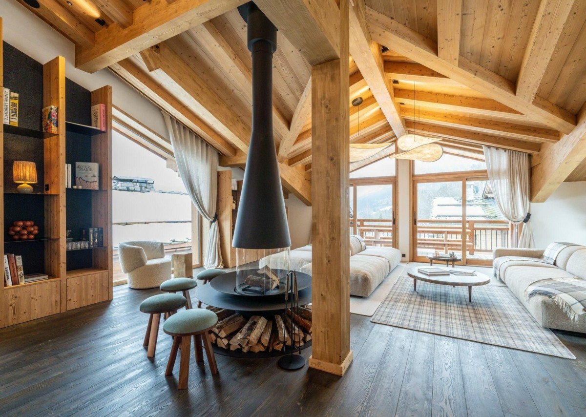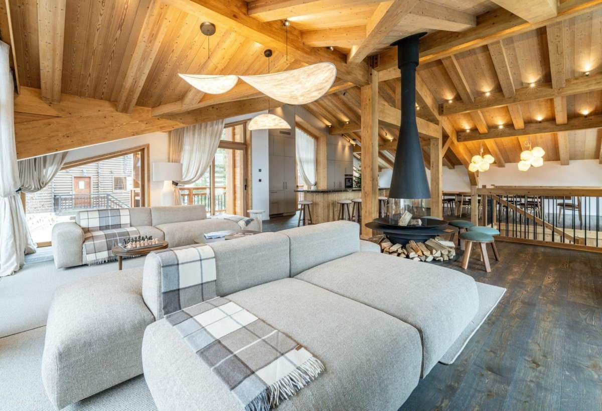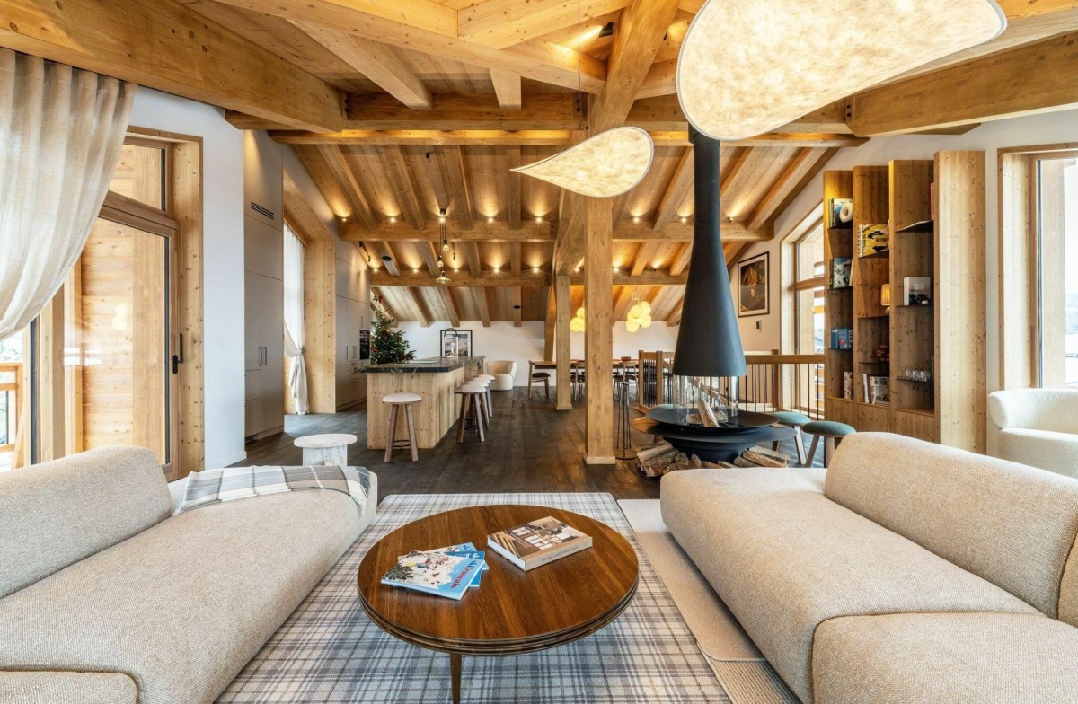 Spread across four levels and built around a striking central staircase, the chalet features refined architecture combining natural stone and wood. The interior is meticulously crafted, featuring soft tones and calming materials to create a welcoming and sophisticated ambiance.