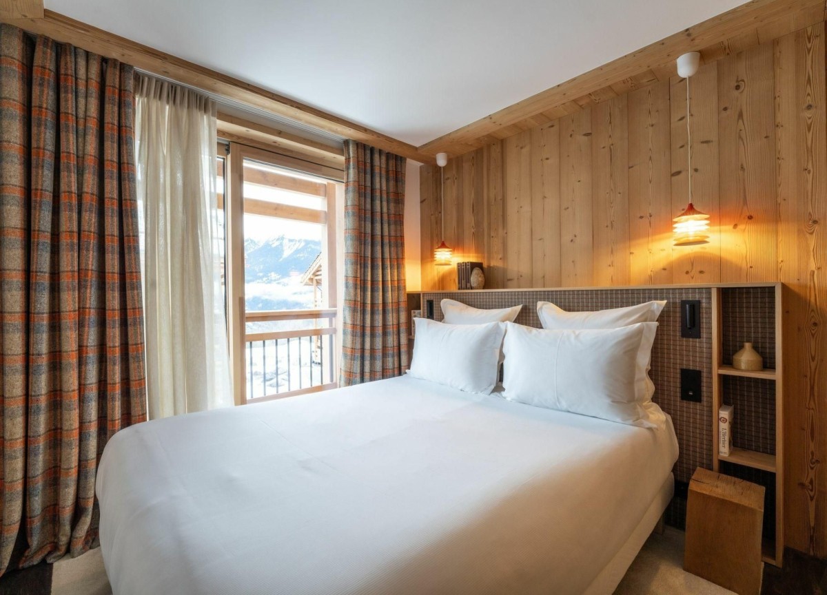 Chalet Beloukha offers five en-suite bedrooms, including a spacious master suite and a children's bedroom, comfortably accommodating up to 8 adults and 4 children. At the top level, the open-plan living space features two lounges, a fully equipped kitchen, and a dining area, each centered around a beautiful fireplace. Expansive bay windows flood the space with natural light and provide stunning 360° views, opening onto a terrace and balcony for indoor-outdoor living.