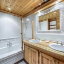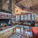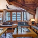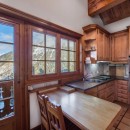 The five-bedroom chalet offers simply stunning views from every room, and most guests will find themselves congregating in the enormous great room with its blonde wood ceilings and floors and its gorgeous, hand carved furnishings also in a honey-hued wood. Relax on the banquette or cozy up in an armchair by the fire. Stylish décor and artisan finishes make this a visual feast of a living space. There is also a separate TV snug and breakfast area just off the full-sized, gourmet kitchen. With its wood cabinetry and amazing views, along with balcony access, it is a delight. Nearby is the formal, full-sized dining suite.