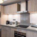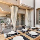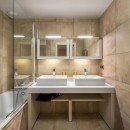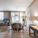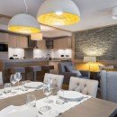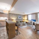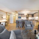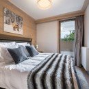 Apartment 112, spanning 81m², offers comfortable accommodation for up to four individuals. This exquisite space comprises a master bedroom and a twin room, each accompanied by its private bathroom. The generously proportioned living area seamlessly integrates the lounge, dining, and kitchen spaces. A serene ambiance is fostered by the interplay of light wood, gentle hues, and carefully selected materials. Through the expansive bay windows, the panorama of snow-draped peaks unfurls, providing an ever-changing backdrop to the large covered terrace.
