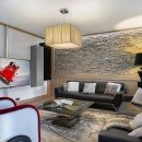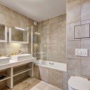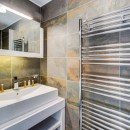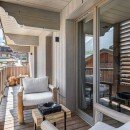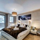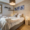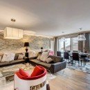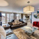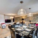 Perched on the third floor of the residence, Carré Blanc 233 apartment graciously accommodates up to 8 individuals across three double bedrooms. Among them, two bedrooms boast en suite facilities with either a bathroom or a shower room, while an additional bedroom features two trundle beds. The living area, seamlessly encompassing an open kitchen, dining section, and lounge, seamlessly connects to twin balconies that offer breathtaking mountain vistas. The meticulous attention to detail shines through in elements like exquisite pendant lighting, a mobile red armchair, and a delicate fusion of soft hues that harmonize seamlessly with the apartment's natural materials. The walls, adorned in stone or wood, accentuate its classic and stylish essence, further accentuated by the captivating open kitchen.