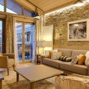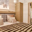 The apartment's interior exudes warmth through its color palette of rich hues, complemented by wood and stone elements alongside sleek lines that cultivate a snug ambiance. This carefully curated design strikes a harmonious balance between the contemporary trends of the day and the cherished traditional Alpine aesthetics synonymous with Courchevel.