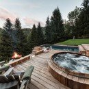 Of course, the shared and private living spaces enhance the appeal of the property, with a large great room facing out towards the scenery and opening to the terraces. It includes a large lounge area with a fireplace, a stylish dining area, and an open-air kitchen. The six luxurious bedrooms are divided between the ground and first floors and include a king suite, a family suite, and four additional king suites. All have large private baths as well as nice views of the woods or mountains.