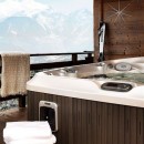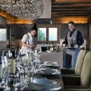 At the heart of the home is the luxurious first-floor living space, a showcase of modern mountain elegance with a designer fireplace and dual lounge areas. Floor-to-ceiling windows open onto expansive terraces that frame breathtaking panoramic views. A bubbling Jacuzzi awaits for après-ski relaxation, whether basking in the midday sun or unwinding beneath a star-studded alpine sky.