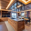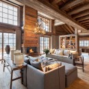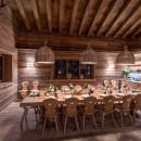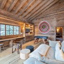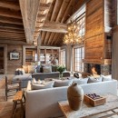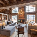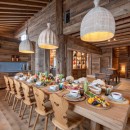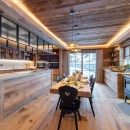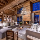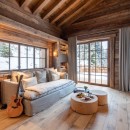 Upon entering the Chalet Domaine de l'Orme on the ground floor, you are greeted by a warm and inviting living space. A statement chandelier captures attention, while vast windows spanning the entire wall draw your gaze outside to the breathtaking snow-covered landscape, flooding the room with light.
