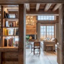 Decorated in russet tones with plush seating around the stone hearth of the fireplace, this area is perfect for entertaining or simply relaxing with loved ones as snow falls outside. A small table in the corner invites you to enjoy after-dinner games, while ambiently lit bookshelves lining the walls add a homely touch and character to the high-ceilinged room.