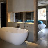 Bedroom 5 : Second floor bedroom with queen-size bed, private balcony and open bathroom with bathtub, vanity and WC. 2 guests max.