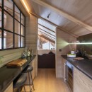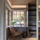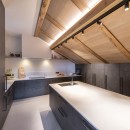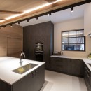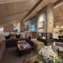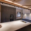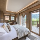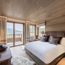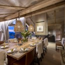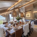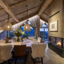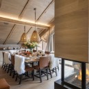 The top floor features an impressive open-plan living and dining area with an adjacent bar and TV snug. The central fireplace serves as a focal point, enhancing the room’s inviting and elegant ambiance. Large double-height windows flood the space with natural light by day, while sophisticated lighting creates a cozy atmosphere by night. The living area is perfect for relaxing and sharing stories from the slopes, with large double doors leading to a balcony offering panoramic valley views. The adjacent bar and TV snug, separated internally by bronzed-framed windows, provide a cozy, cabin-like feel. The dining area is designed for memorable meals, with a table that comfortably seats 12 guests. The modern kitchen, which can be closed off from the dining room, is a dream for any cooking enthusiast.