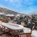 The chalet’s living area is the heart of the home, featuring two inviting TV lounges separated by a cozy fireplace, ideal for gathering with family and friends. The kitchen is open to the dining area, where you can enjoy meals together while overlooking the south-facing terrace. The terrace offers stunning panoramic views of the surrounding mountains, perfect for soaking in the breathtaking scenery after a day of adventure.