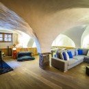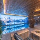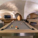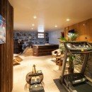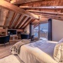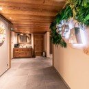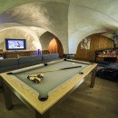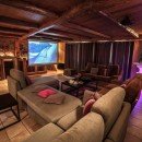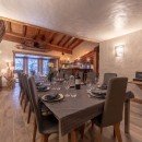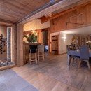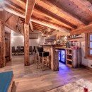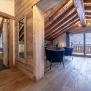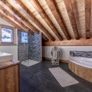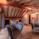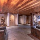 The villa itself features the classic ski room with boot warmers, but it also has an appealing wellness area where you can enjoy time in the oversized Jacuzzi, the fitness room, or the sauna. The interiors are classically designed with high, heavily beamed ceilings, stone floors and walls, and oversized furnishings that create an appealing variety of lounge areas. The fireplace is surrounded by a banquette sofa and there is also a casual media area. A common room provides a working office space, and there is a large dining room that opens to the terrace. The fully-equipped professional kitchen is at this level too.