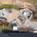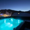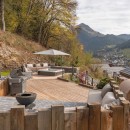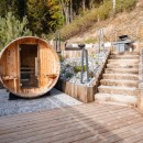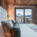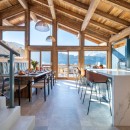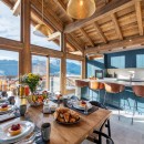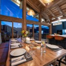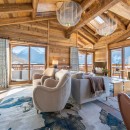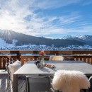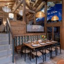 The top floor features an open-plan kitchen and dining area, leading up to a large mezzanine lounge with cozy seating, a large screen TV, and a log fire. Floor-to-ceiling windows showcase panoramic views of the town and the majestic mountains beyond, including the slopes of the Pleney. A generous wrap-around balcony with a dining table and comfortable seating is perfect for al fresco meals in summer or enjoying après-ski drinks while watching the sunset. The landscaped garden at the back of the chalet offers a serene escape after a day on the slopes, complete with a hot tub, barrel sauna, and fire pit.