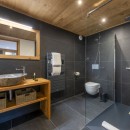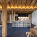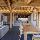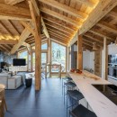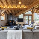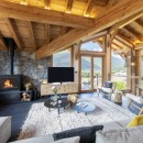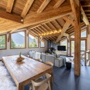 The entire top floor is dedicated to open-plan living, where guests can revel in breathtaking valley views through floor-to-ceiling windows. The kitchen is elegantly equipped with comfortable island seating, complemented by a spacious dining table for ten. The living area is designed to maximize those spectacular mountain vistas while you unwind by the log fire.