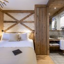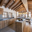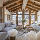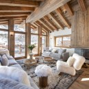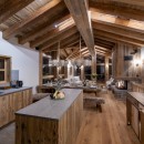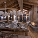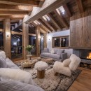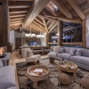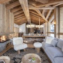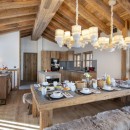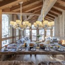 The main living area on the top floor is bathed in natural light during the day, thanks to the chalet's high double-vaulted ceilings, large floor-to-ceiling windows, and a triple north, west, and south-facing aspect. As daylight fades, guests can sink into the inviting sofas, accented by furs and designer furnishings, and enjoy the warmth of the wood-burning fireplace. A statement dining table seating ten offers stunning mountain views, enhanced by the soft glow of evening light. The fully equipped open-plan kitchen, seamlessly integrated with an island, adds to the sociable aspect of this space.