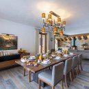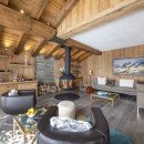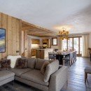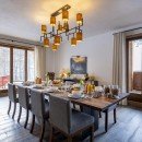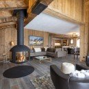 The open-concept living and dining space radiates with generosity and warmth. Adorned with a predominantly neutral palette, enriched with lustrous woods and textured fabrics, the ambiance exudes refined elegance. Thoughtfully curated art pieces add splashes of color throughout the room. The capacious dining table accommodates up to ten, presided over by a sleek, contemporary kitchen replete with essential amenities and ample storage for a clutter-free environment. A harmonious blend of glamour and functionality, this area invites leisurely, convivial meals shared with loved ones. The central fireplace, a circular marvel, becomes the focal point of the adjoining living area, fostering a cozy and inviting atmosphere. An expansive L-shaped sofa and a pair of armchairs provide seating for up to eight. The living space is tastefully finished in neutral grays and earthy tones, accented by hints of blues, culminating in a chic and modern ambiance. Towering floor-to-ceiling windows frame breathtaking vistas of the iconic La Face piste. A visitor's WC graces the entrance hallway.