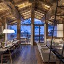 Entering through the main door on the third floor, you'll find a spacious ski and boot room adjacent to the entrance, thoughtfully designed to accommodate equipment, while the reception area offers coat and winter accessory storage. To the right, the captivating open-plan lounge and dining area beckon. The double-height ceilings and expansive windows create a sense of spaciousness, bathing the room in natural light during the day and framing an enchanting moonlit mountain landscape at night. Rich wooden walls and ceilings infuse the space with warmth and timeless charm. A ladder leads to a cozy library on the mezzanine level.