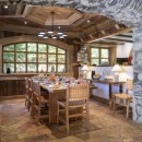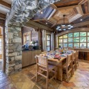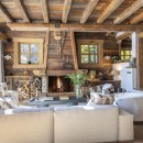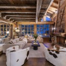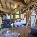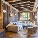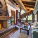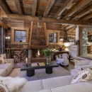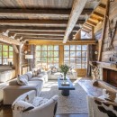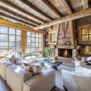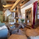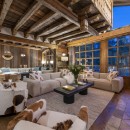 Entering the chalet on the first floor, you're greeted by a bright and spacious living area. The double-height ceilings and large bay windows create a stunning impression and provide magnificent views. This space, featuring a bar area and TV snug, with rustic dark wood walls, is perfect for entertaining.
