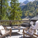 The property showcases a charming blend of classic Alpine architecture and contemporary furnishings. The large terrace accessible from the living area offers magnificent views and is surrounded by tall pine trees, creating a secluded, magical atmosphere when covered in snow.