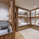 The first floor offers a luxurious spa with a relaxation area, hot tub, sauna, and shower—a perfect retreat for rejuvenating ski-weary muscles. The master bedroom on this floor features an en-suite bathroom with a separate shower and twin sinks, TV, and a dedicated desk area. Another double bedroom with a private balcony, TV, and access to a separate shower room adds to the luxury. Additionally, a cozy children's quad bunk room, sleeping four, includes a TV and en-suite bathroom with a separate shower and twin sinks. Please note this bedroom lacks windows and natural light.