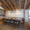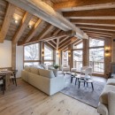 The top floor is the heart of the chalet, featuring an open-plan living, dining, and kitchen area. The bespoke design and furnishings create an intimate atmosphere, enhanced by stunning mountain views and a cozy wood-burning fireplace.