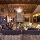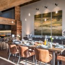 The property also boasts a fully-equipped ski room and a laundry suite in addition to two underground parking spaces. There is a wonderful array of shared and private living spaces to enjoy during your visit, and this includes the impressive great room with its silvery grey, rich blue and natural hues of cream and blonde wood creating a wonderful setting. Whether in the living room area with the great stone fireplace, banquette sofas and wall of glass doors facing the views or the gorgeous dining area, you will feel an immediate sense of welcome and tranquility. There is a breakfast bar opening into the impressively furnished kitchen, and contemporary art creates a dynamic atmosphere throughout. The TV snug in the mezzanine will quickly become a favorite spot for teens and kids.
