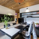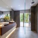 The first floor features a striking split-level open-plan living and dining area with a double-height ceiling. Furnished with elegant fabrics and furniture in warm, neutral colors, this space is perfect for entertaining. Large sliding doors allow sunlight to pour in during the day and provide access to a fantastic wrap-around balcony. The dining table can seat up to 12 guests, with an additional table accommodating up to 18 guests. This floor also includes four en-suite bedrooms, an office, and a service kitchen.