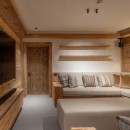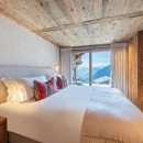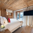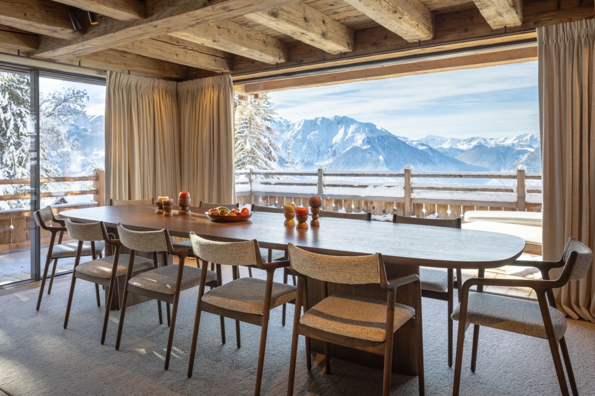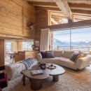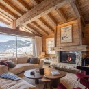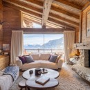 Spread across four levels, the chalet offers five beautifully designed en-suite bedrooms, including a luxurious top-floor master suite with a private balcony and panoramic mountain views. The expansive open-plan living area on the first floor features a curved sofa, velvet armchairs, and a wood-burning fireplace, all framed by floor-to-ceiling windows and two sun-soaked terraces.