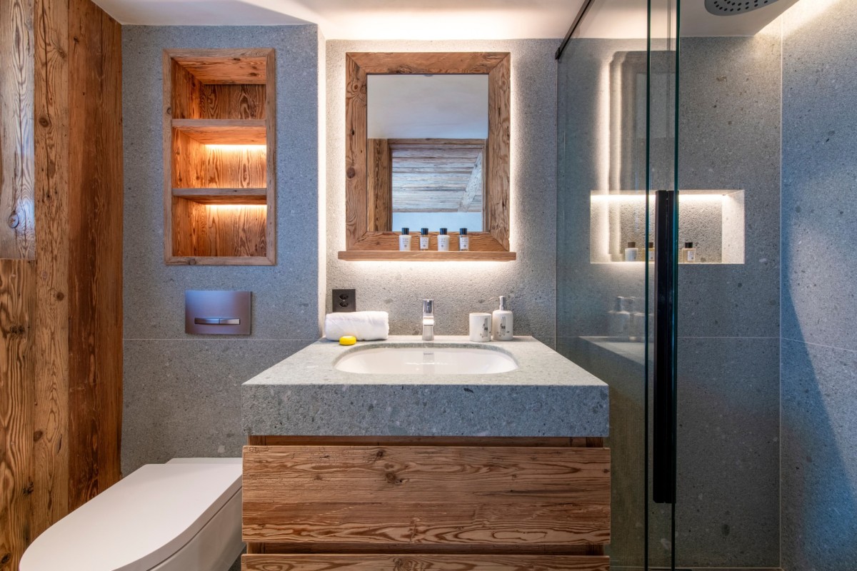 The ground floor is dedicated to relaxation and entertainment, featuring a private cinema room, sauna, hammam, and a ski and boot room with heated racks. A nearby laundry room adds extra convenience.